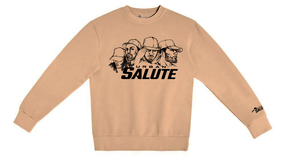 This crewneck features exclusive Urban Salute artwork — a lineup of four saluting figures wearing caps, printed in sleek black ink on soft premium fleece. A timeless statement piece blending art, honor and respect.